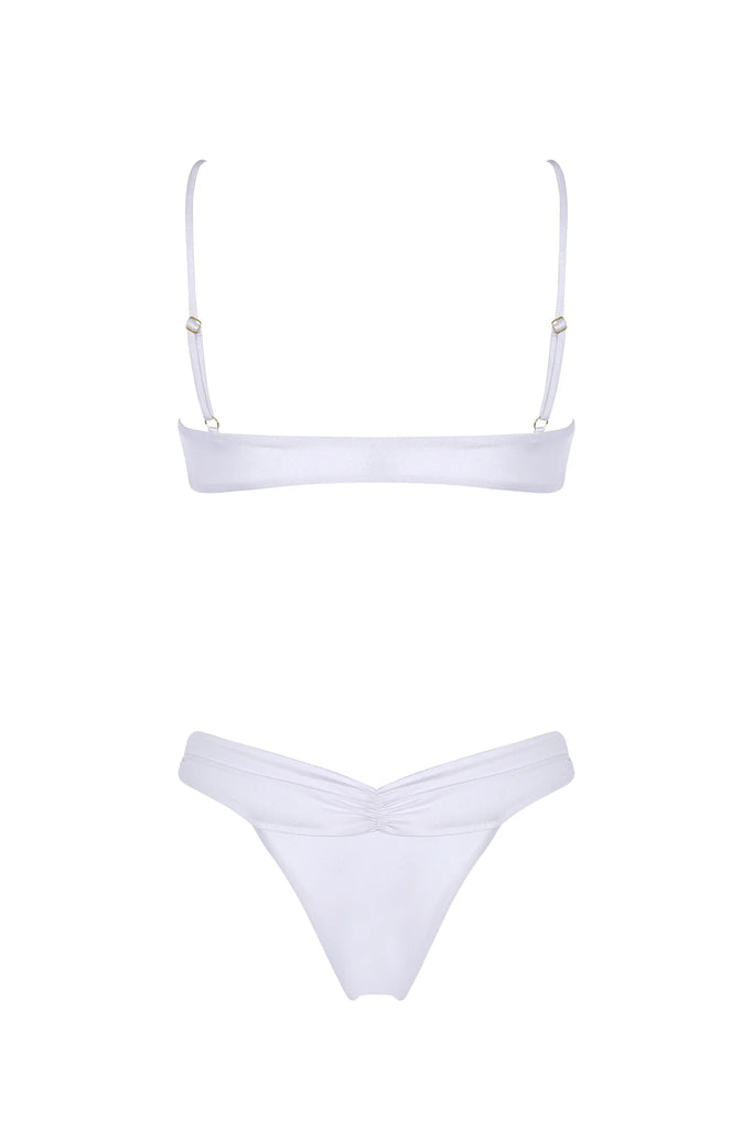 Minimalist sophistication with charming details. This white bikini top stands out with its modern round neckline and cropped design, blending style and freshness. The adjustable straps, adorned with delicate bows, allow for a personalized fit while adding a subtle, feminine touch.
