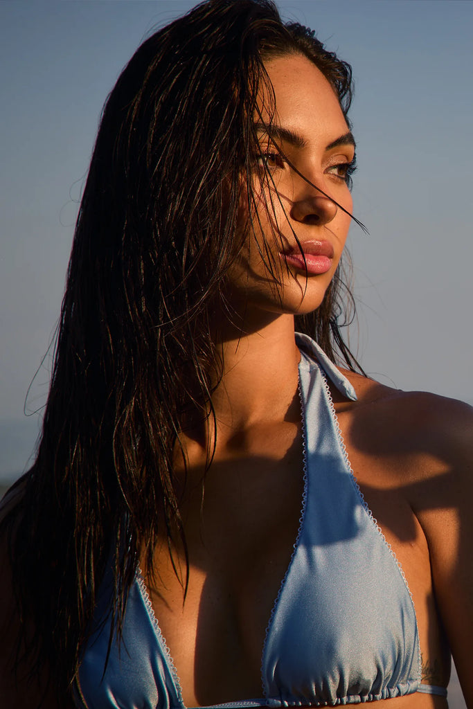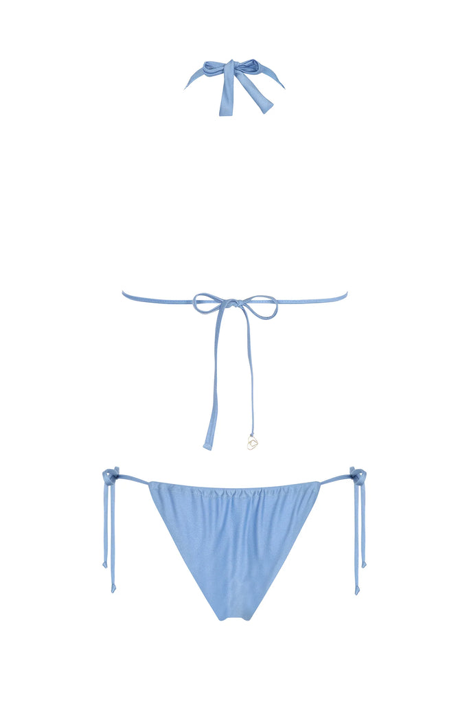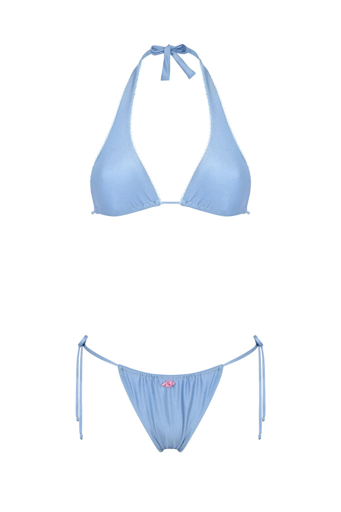 Personalized comfort with a feminine and sophisticated touch. The Azure panties feature side ties that allow for an adjustable fit to perfectly suit you. Their delicate floral detail at the front center adds elegance, while the beautiful sky blue color makes them the ideal match for the Azure top—creating a perfect set to wear with style and freshness under the sun.