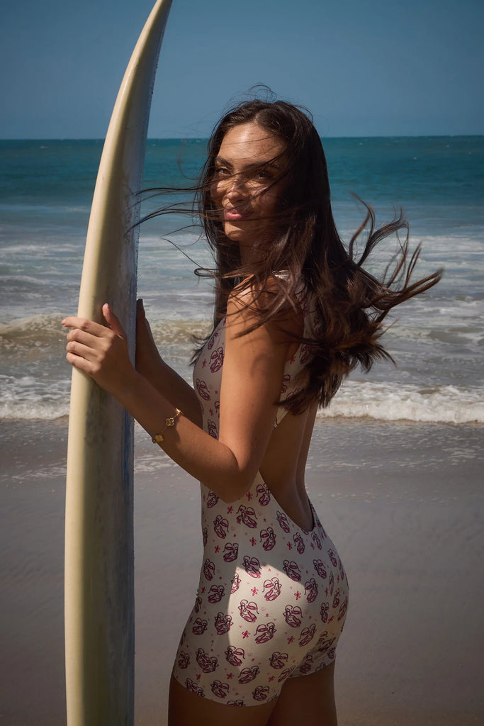 Elegance in motion and conscious functionality in one piece. Our Ballerina print one-piece blends the grace of dance with the versatility you need for any activity. Featuring a halter neckline and open back, this design offers freedom and style—perfect for surfing, yoga, pilates, or simply strolling in comfort.
